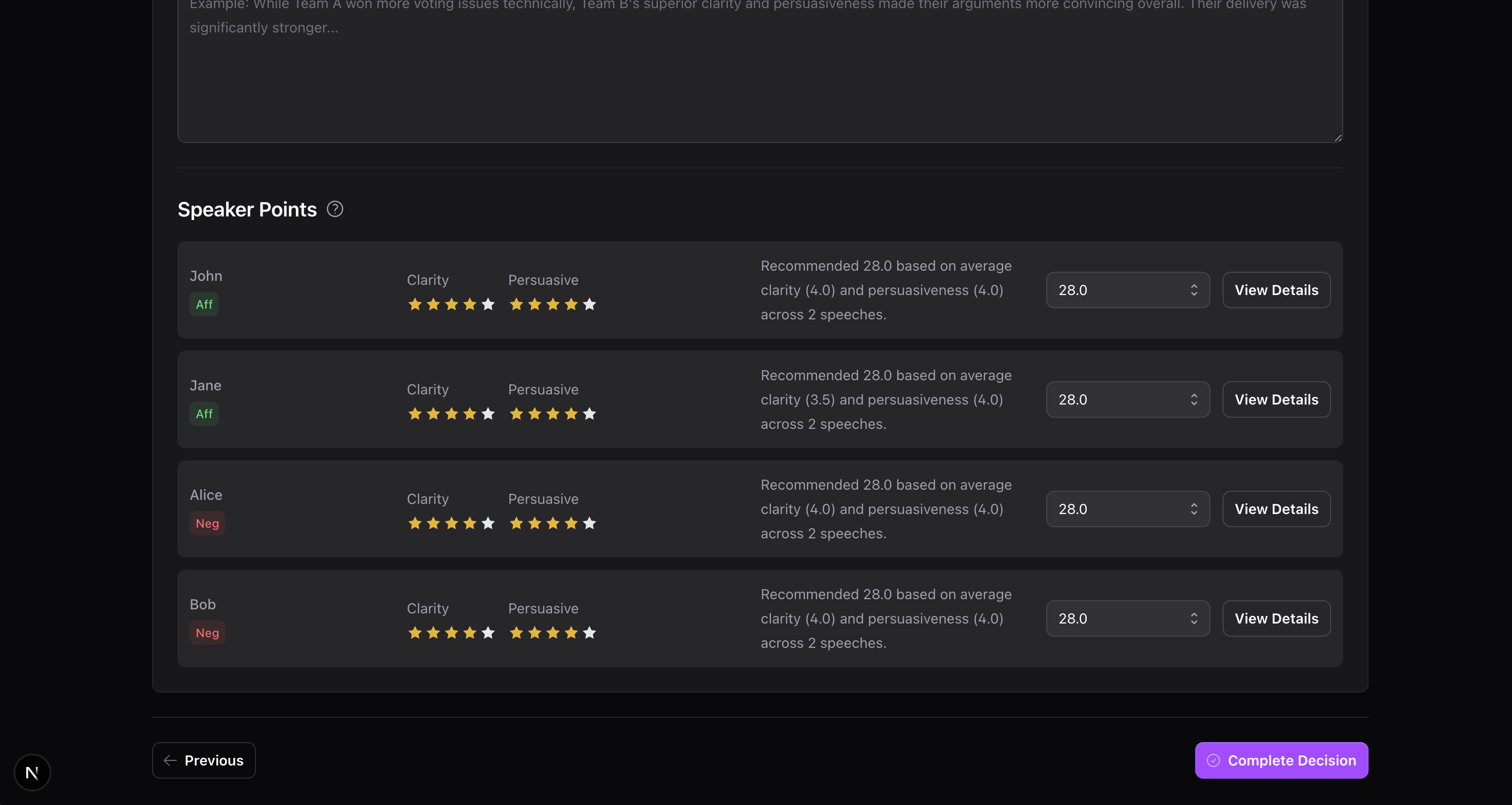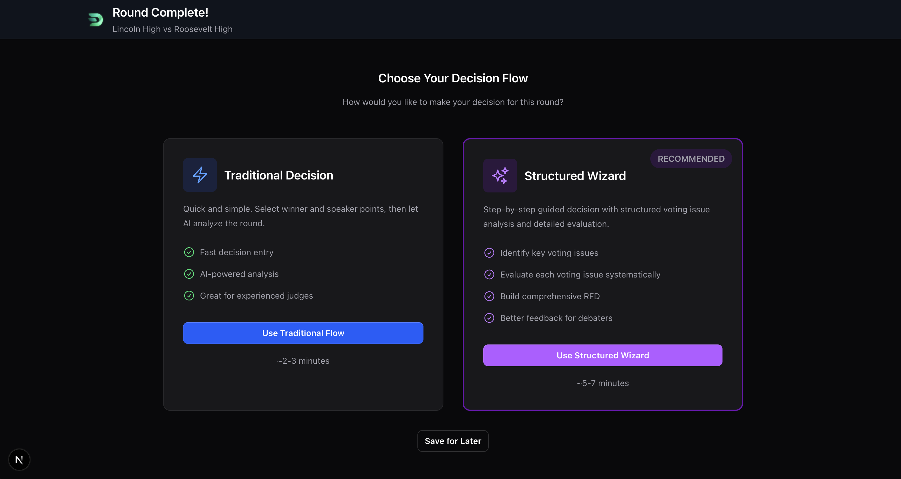 After the round ends, it's time to make your decision. This is often the hardest part—you've just heard 30-40 minutes of arguments, and now you need to figure out who won. The Decision Wizard is here to help.